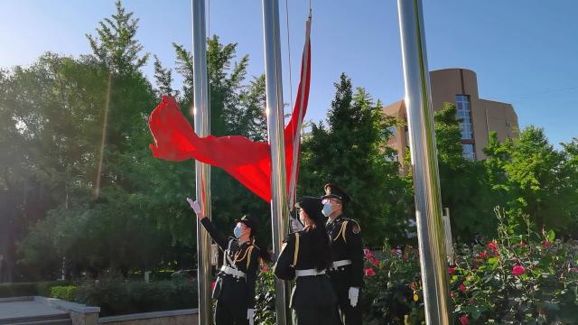 六点四十分,英姿飒爽的国旗班护卫队队员们护送鲜艳的五星红旗进场,五星红旗冉冉升起,迎风飘扬,在场的每一个人向国旗行注目礼,深怀对祖国无限的热爱和崇高的敬意,五四升旗活动暨“学四史 守初心 践未来”动员大会拉开序幕。