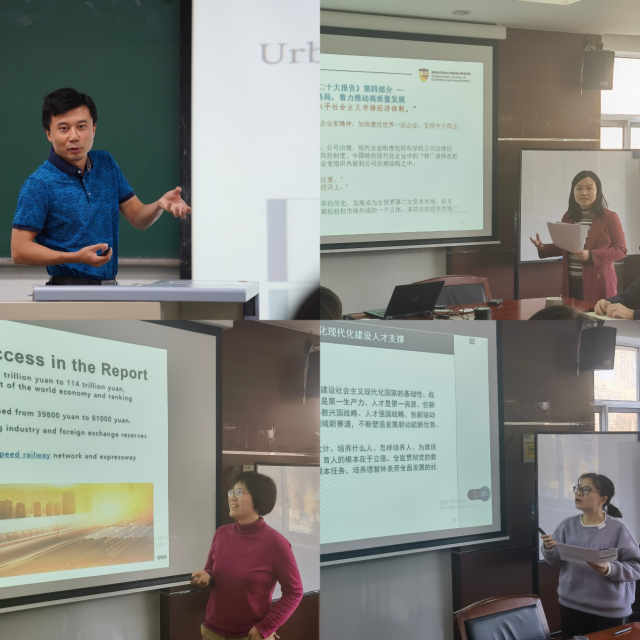 党总支委员、教师党支部书记牛毅副教授在《城市与房地产经济学》课堂上,将二十大报告多次提到的与本课程直接相关的专有名词“城市”和“城镇”,通过涵义辨析、中外比较、政策启示等环节,对其概念本质进行了深刻透彻的讲解,既有助于同学们更准确理解二十大报告,又为本课程的讲授奠定了坚实的概念基础。