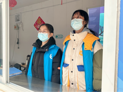 2022级志愿者陈振楠和2021级志愿者汪涵负责下午时间段的志愿服务工作,服务时间直至傍晚。寒冷的天气和灰暗的天色没有阻碍他们的热情与责任感,依然坚持为有需求的人士提供暖心帮助。