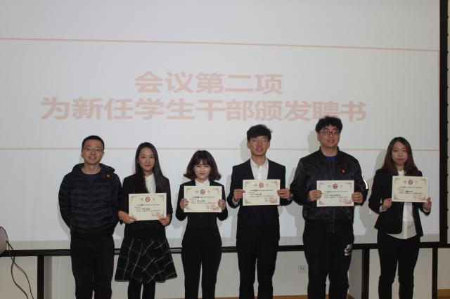会上,金湜公布了第四届学生干部名单,共有45学生干部受聘。金湜和徐敬尧分别为研究生和本科生新任学生干部颁发聘书并合影留念。