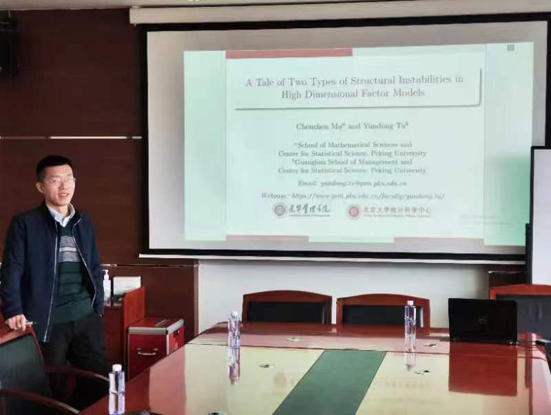 涂云东老师学术报告的题目为《A Tale of Two Types of Structural Instabilities in High Dimensional Factor Models》(《高维因子模型中的两种结构不稳定性》),该论文利用最前沿的机器学习方法,研究了高维因子模型中的不稳定性,这种不稳定性既可能由于结构断裂而产生,也可能是一种阈值效应,论文对这两种不同的机制进行了识别和估计,为高维因子模型的降维和估计提供了更为可靠的理论方法基础。